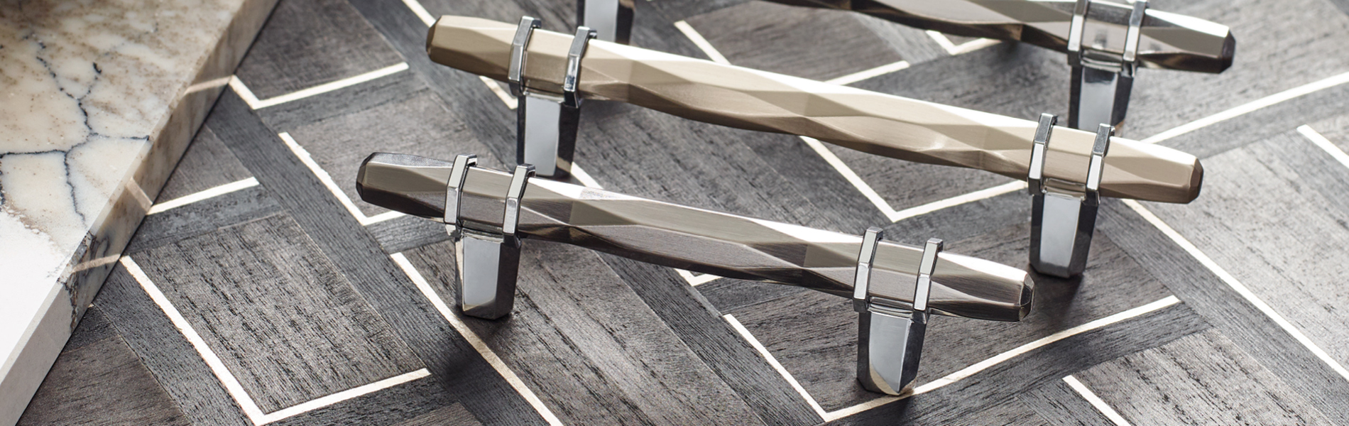 With its faceted forms and clean geometric patterns, the London collection creates a sophisticated modern statement. Crisp lines marry with an assembled, split finish design for something truly dramatic.